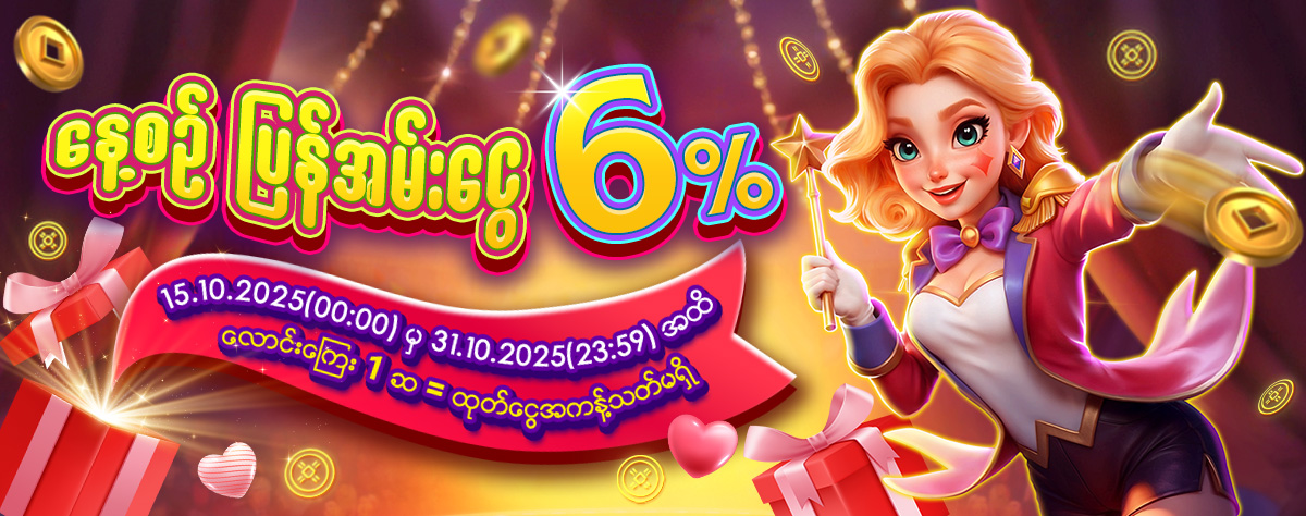 🎉 1.10.2025 မွ 31.10.2025 အတြင္း ဂိမ္းကစားထားသည့္ ႀကိမ္ေရ 3,000 မွတ္ ရွိပါက Lucky Month ကံစမ္းမဲ တစ္ေစာင္ရရွိမည္။