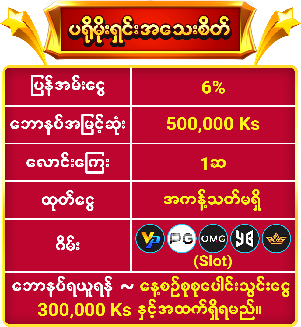 📌 ေန႔စဥ္ စုစုေပါင္းသြင္းေငြ 300,000 Ks ႏွင့္ အထက္ ရွိပါက မန္ဘာတိုင္း တစ္ရက္ တစ္ႀကိမ္ ေဘာနပ္ခံစားႏိုင္သည္။